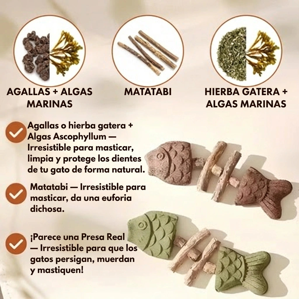 A diferencia de palitos duros o cepillos, Purrident combina algas marinas naturales que curan las encías y eliminan la acumulación con Catnip o Gallfruit que los gatos no pueden resistir. Es una forma divertida y eficaz de limpiar los dientes — sin estrés, sin cepillado, solo juego.