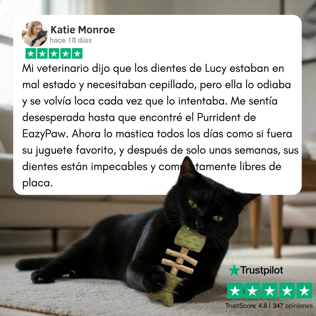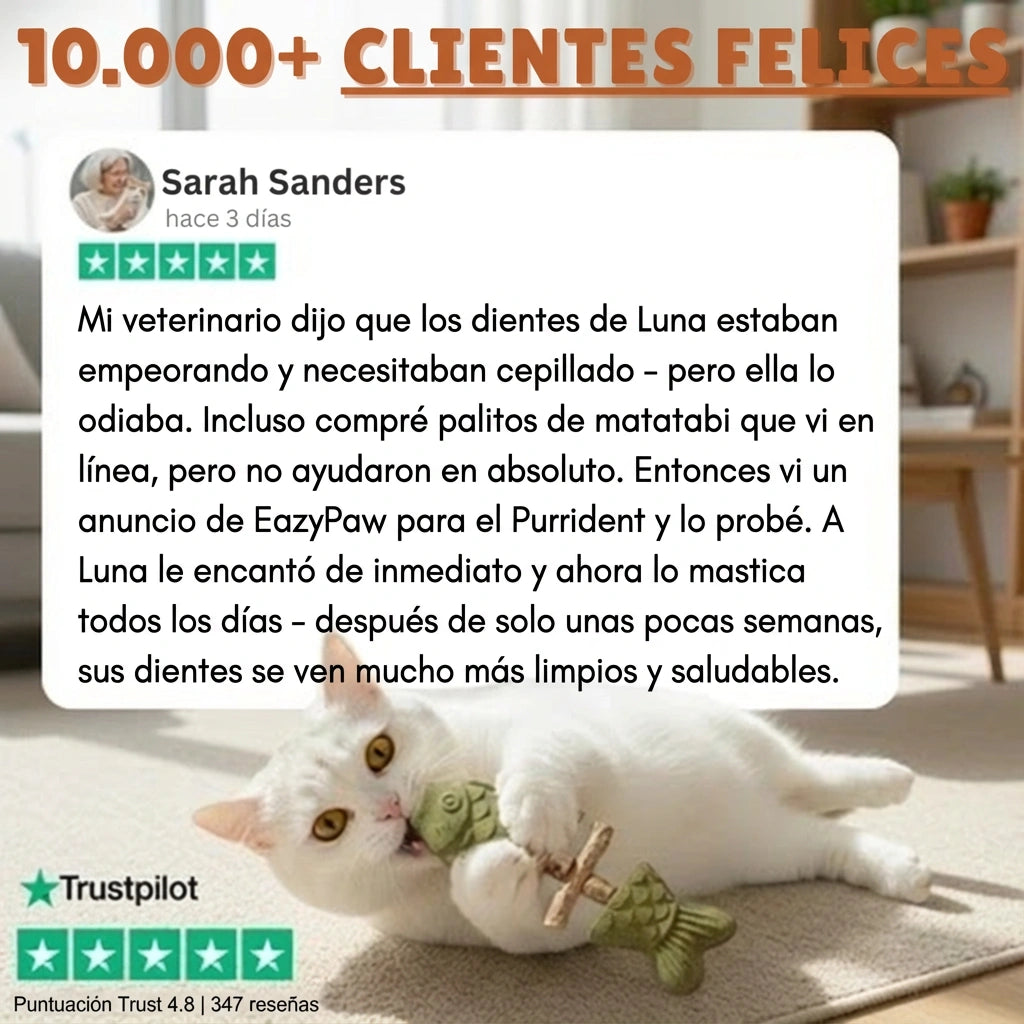 A más del 95% de los gatos les encanta Purrident™ — incluso a los que normalmente ignoran los juguetes. La mezcla de Catnip o Gallfruit crea una euforia natural que los mantiene masticando felices mientras limpia suavemente sus dientes.