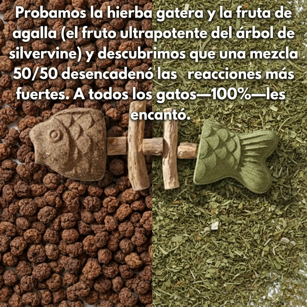 Extraído del árbol de Silvervine, el Gallfruit genera una respuesta eufórica aún más fuerte que el catnip, asegurando que tu gato siga emocionado por masticar.